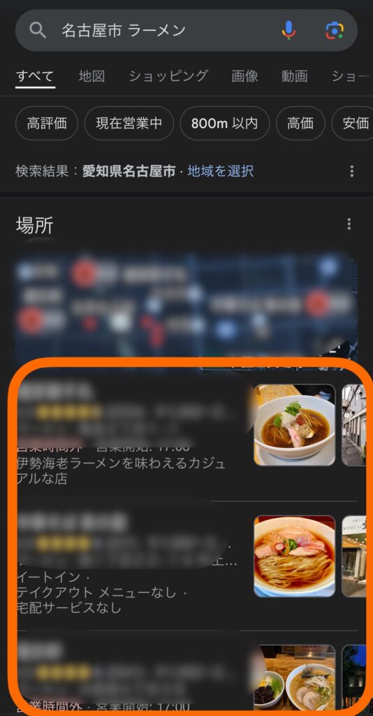 たとえば、「近くでおいしいラーメン屋さんを探したい!」と思ったとき、スマートフォンで地図アプリを開いて「○○市 ラーメン」と検索しますよね。その時に、もしそのラーメン屋さんのMEO対策ができていれば、検索結果の上位に表示されるので、そのラーメン屋さんを見つけやすくなります。
